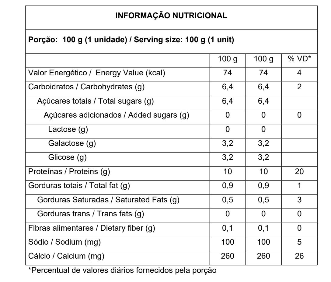 Leite semidesnatado e/ou reconstituído semidesnatado, preparado de morango (água, polpa de morango, amido modificado, aromatizantes, corante carmins, estabilizante goma guar, edulcorante sucralose, acidulante ácido cítrico e conservador sorbato de potássio), concentrado proteico de leite em pó, concentrado proteico de soro de leite em pó, soro de leite em pó, enzima lactase e fermentos lácteos.