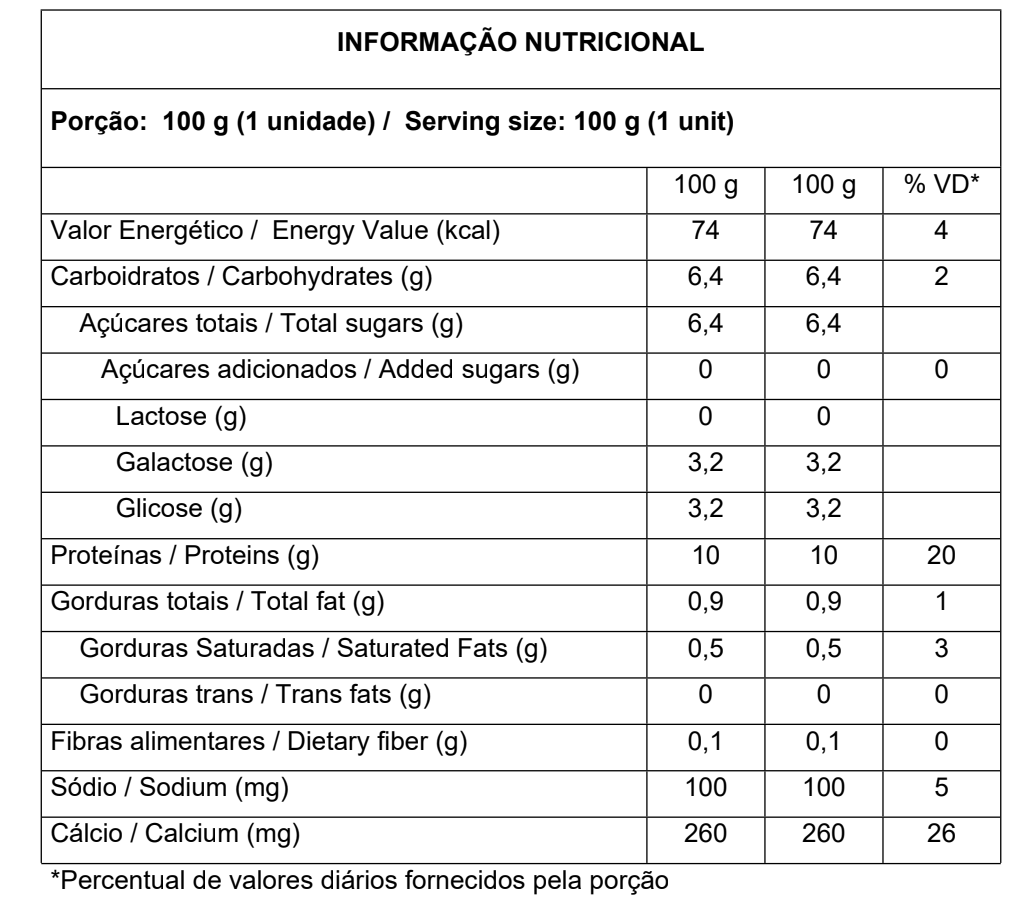 Leite reconstituído semidesnatado, preparado de coco (água, polpa de coco, amido modificado, aromatizantes, estabilizante goma guar, acidulante ácido cítrico, edulcorante sucralose e conservador sorbato de potássio), concentrado proteico de leite em pó, concentrado proteico de soro e leite em pó, soro de leite em pó, enzima lactase e fermentos lácteos.
