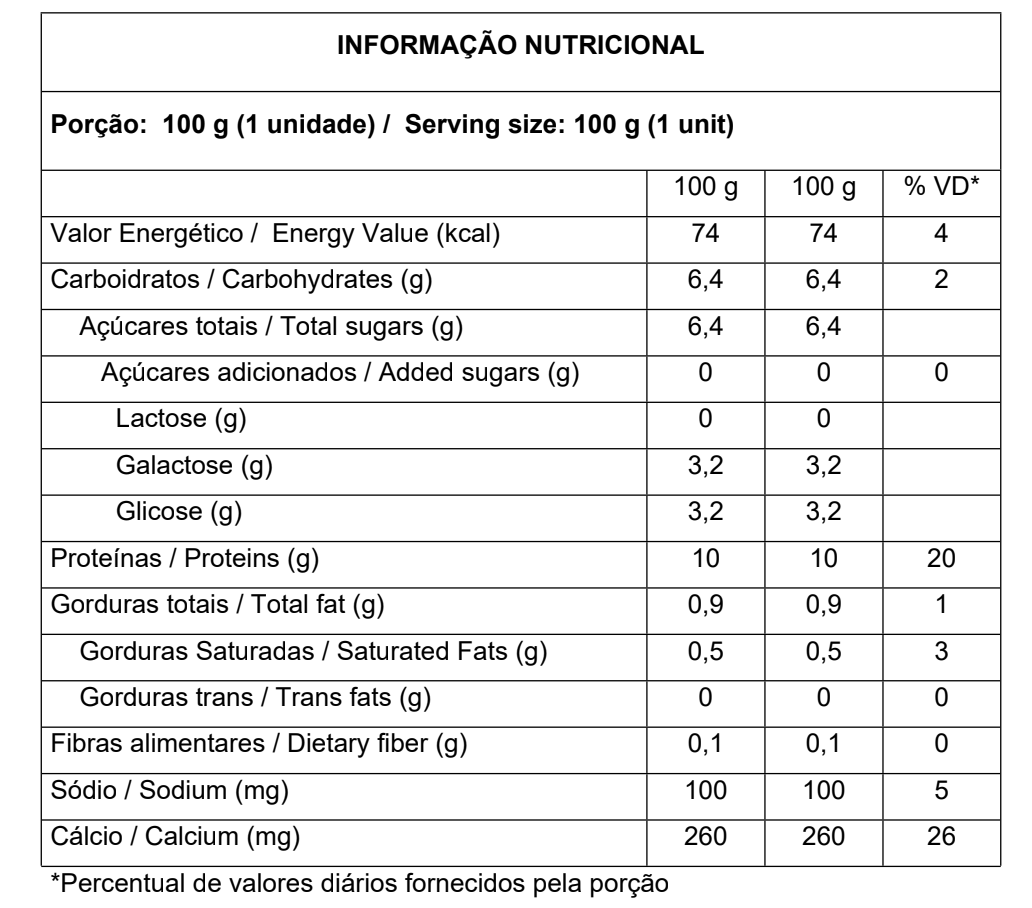 Leite reconstituído semidesnatado, preparado de morango (água, polpa de morango, amido modificado, aromatizantes, corante natural carmins, estabilizante goma guar, acidulante ácido cítrico, edulcorante sucralose e conservador sorbato de potássio), concentrado proteico de leite em pó, concentrado proteico de soro e leite em pó, soro de leite em pó, enzima lactase e fermentos lácteos.