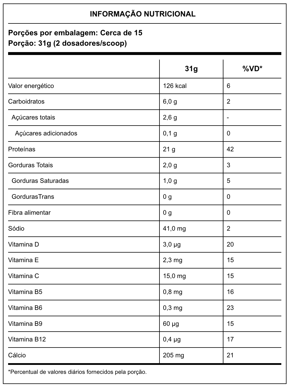Concentrado proteico de soro de leite (concentrado proteico de soro de leite e emulsificante lecitinas), maltodextrina, mix de vitaminas e mineral [fosfato de cálcio tribásico (cálcio), maltodextrina, ácido ascórbico (vitamina C), acetato de DL-alfa-tocoferol (vitamina E), colecalciferol (vitamina D), D-pantotenato de cálcio (ácido pantotênico – vitamina B5), cloridrato de piridoxina (vitamina B6), ácido fólico (vitamina B9) e cianocobalamina (vitamina B12)], estabilizantes goma guar e goma xantana, aromatizantes, edulcorante sucralose e regulador de acidez ácido cítrico. Contém leite e derivados e derivados de soja. Contém lactose. Não contém glúten.