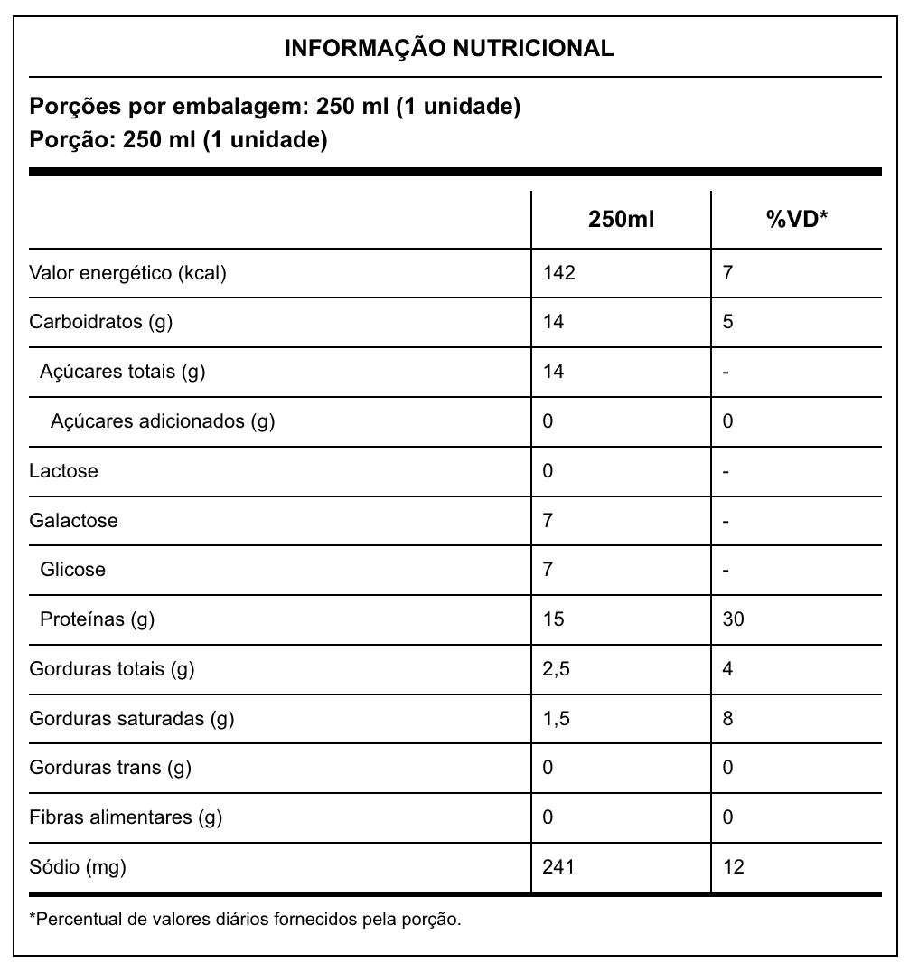 Leite semidesnatado e/ou leite semidesnatado reconstituído, água, caseinato de cálcio, concentrado protéico de soro de leite, amido modificado, café solúvel, soro de leite em pó, cloreto de sódio, enzima lactase, canela em pó, estabilizantes hidrogenofosfato de di-sódio, goma guar, goma gelana e carragena, aromatizantes e edulcorante sucralose. Contém leite e derivados e derivados de soja. Não contém lactose. Não contém glúten. Bebida láctea não é iogurte.
