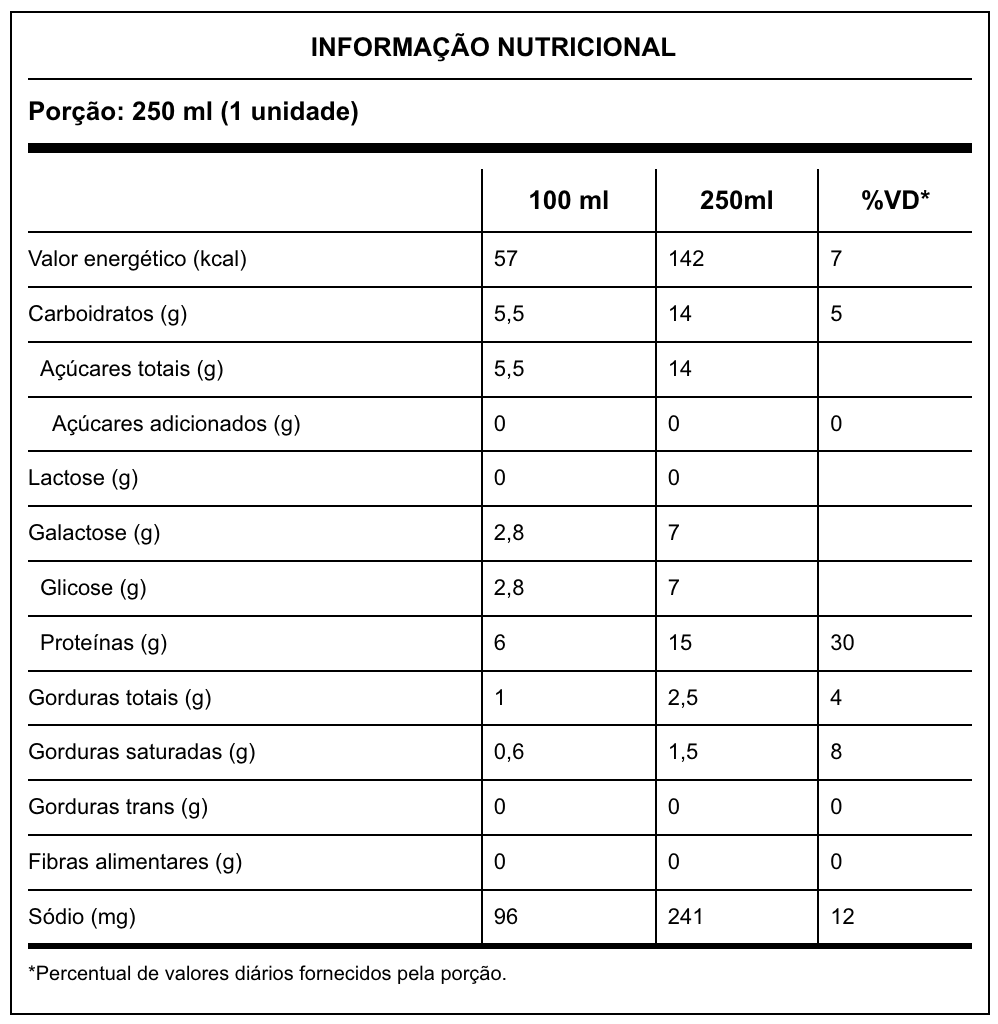 Leite semidesnatado e/ou leite semidesnatado reconstituído, água, caseinato de cálcio, concentrado protéico de soro de leite, amido modificado, soro de leite em pó, cloreto de sódio, enzimalactase, estabilizantes hidrogenofosfato de di-sódio, goma guar, goma gelana e carragena, aromatizantes e edulcorante sucralose. Contém leite e derivados e derivados de soja.