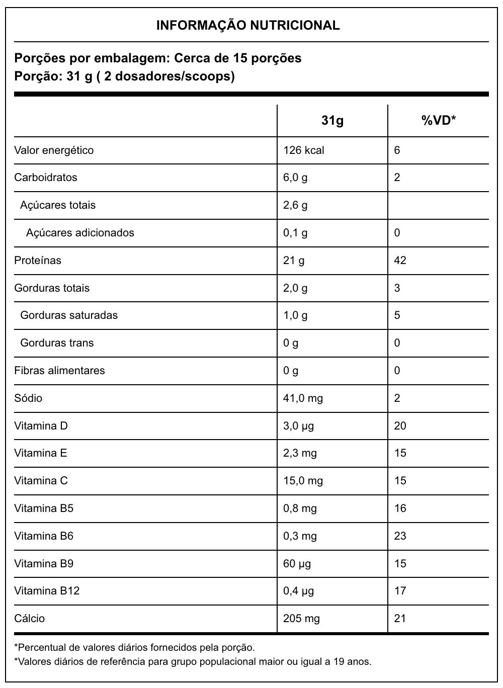 Concetrado proteico de soro de leite (concentrado proteico de soro de leite e emulsificante leticinas), mix de vitaminas e mineral [Maltodextrina, Fosfato de Cálcio Tribásico (cálcio), Ácido Ascórbico (vitamina C), Acetato de DL-Alfa-Tocoferol (Vitamina E), Colecalciferol (Vitamina D), D-Pantotenato de Cálcio (Ácido Pantotênico – Vitamina B5), Cloridrato de Piridoxina (Vitamina B6), Ácido Fólico (Vitamina B9) e CianobalaminaI (Vitamina B12)], Maltodextrina, estabilizantes Goma Guar e Goma Xantana, aromatizantes, corante natural carmim, edulcorante sucralose e regulador de acidez ácido cítrico. Contém leite e derivados de soja. Contém lactose. Não contém glúten.