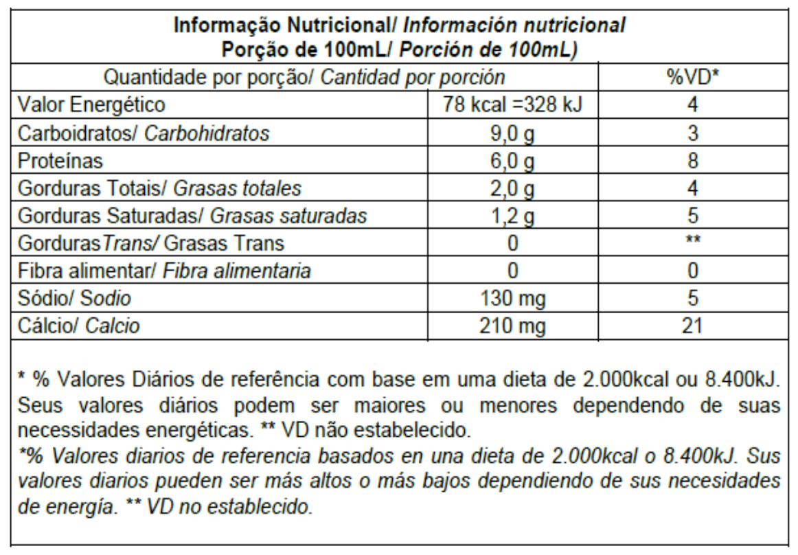 Leite semidesnatado e estabilizantes (trifosfato de sódio, citrato de sódio, monofosfato monossódico e dihidrogênio difosfato dissódico). Contém leite. Pode conter soja. Contém lactose. Não contém glúten.