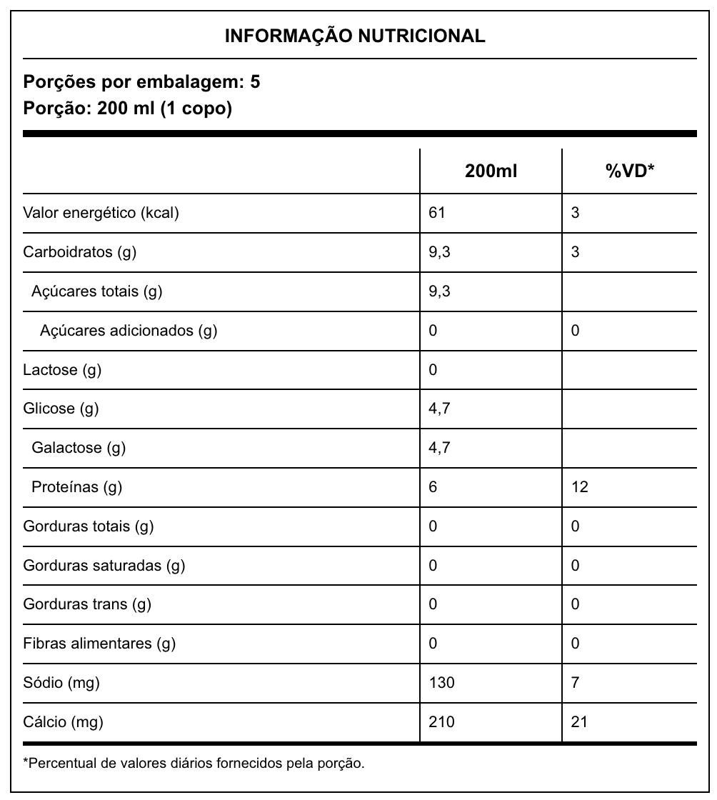 Leite desnatado, enzima lactase e estabilizantes (citrato de sódio, trifosfato de sódio, monofosfato de sódio e difosfato de sódio). Contém leite. Pode conter soja. Não contém glúten. Diabéticos: contém glicose e galactose. Consumir preferencialmente sob orientação de nutricionista ou médico.