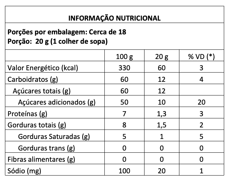 Leite integral, açúcar, glicose, amido de milho, regulador de acidez, bicarbonato de sódio (INS 500ii) e conservador sorbato de potássio (INS 202) Contém: Leite e derivados. Não contém Glúten.